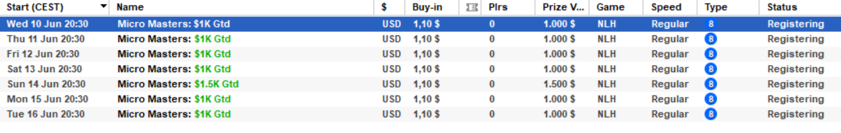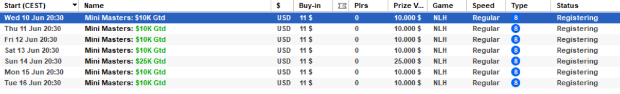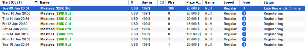 Vrnili so se tudi Masters turnirji in sicer z vstopninami 109$, 11$ in 1,10$. Na teh turnirjih je možen največ en Re-Entry. Sporede turnirjev si lahko pogledate na spodnjih slikah.