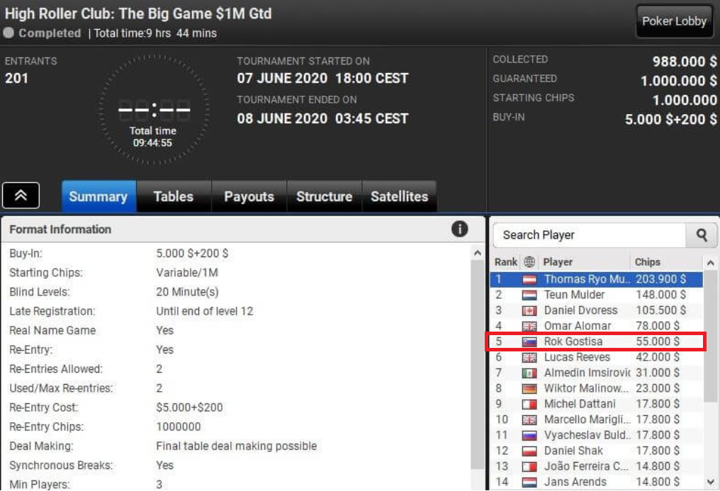 Poleg vseh turnirskih sprememb pa lahko z veseljem poročamo še o lepem uspehu Slovenca na turnirju High Roller Club: The Big Game $1M Gtd, ki se je ponašal s prijavnino 5200$.