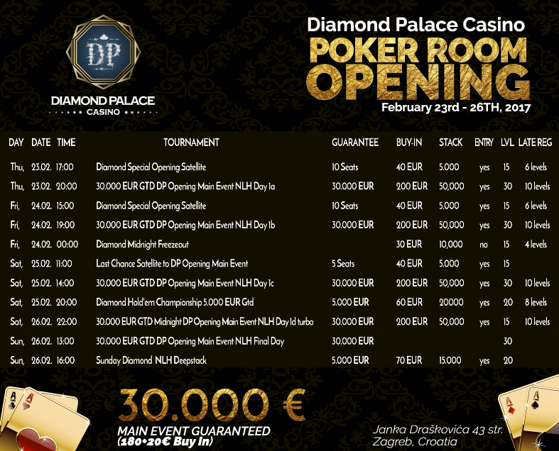 Organizatorji SPT-ja pa zagotavljajo, da je zagrebški Diamond Palace, kjer je casino povsem nov, ustrezna zamenjava za Mond in da bo za igralce dobro poskrbljeno. Od 23. do 26. februarja bo tam tudi potekala uvodna serija ob odprtju Poker Rooma, glavni turnir z 200 € prijavnine pa zagotavlja 30.000 € nagradnega sklada. Glede na bližino hrvaške prestolnice, se prav gotovo obeta tudi udeležba PokerProjevcev. Spored preostalih turnirjev pa si lahko ogledate spodaj.
