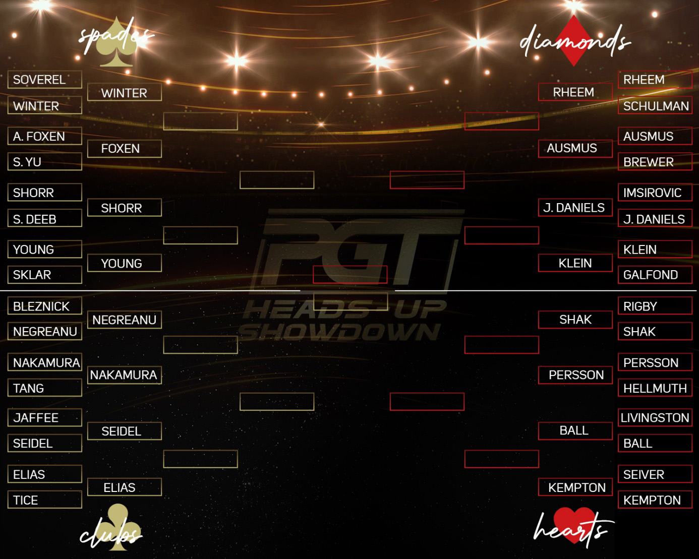 Prvi krog prvega PGT Heads-Up Showdowna je pod streho in 16 igralcev je napredovalo v drugi krog. Najbolj opazni igralci, ki so napredovali so Daniel Negreanu, Erik Seidel, Sean Winter in Shannon Shorr. Vsi igralci so vstopili z $25.000 in se potegujejo za glavno nagrado $400.000.