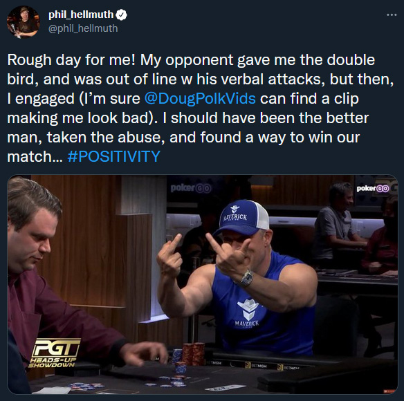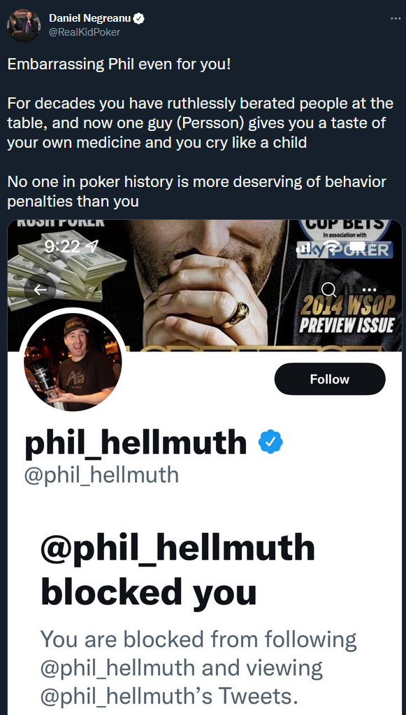 V celotnem čustvenem izbruhu, je Hellmuth na Twittru blokiral vse, ki se niso strinjali z njim. Med njimi je bil tudi Daniel Negreanu!