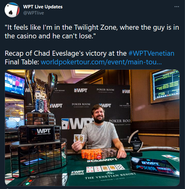 Na žalost nobeni od njih – in ostalima dvema igralcema v sredo na finalni mizi – ni uspelo premagati Chada Eveslagea, ki je dominiral skozi celoten potek finalne mize.