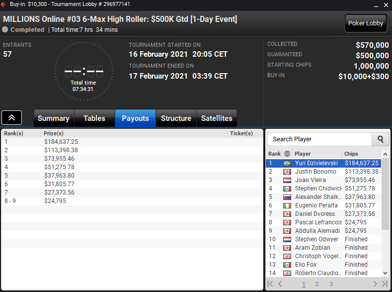 Rezultati finalke MILLIONS Online #09 High Roller Turbo