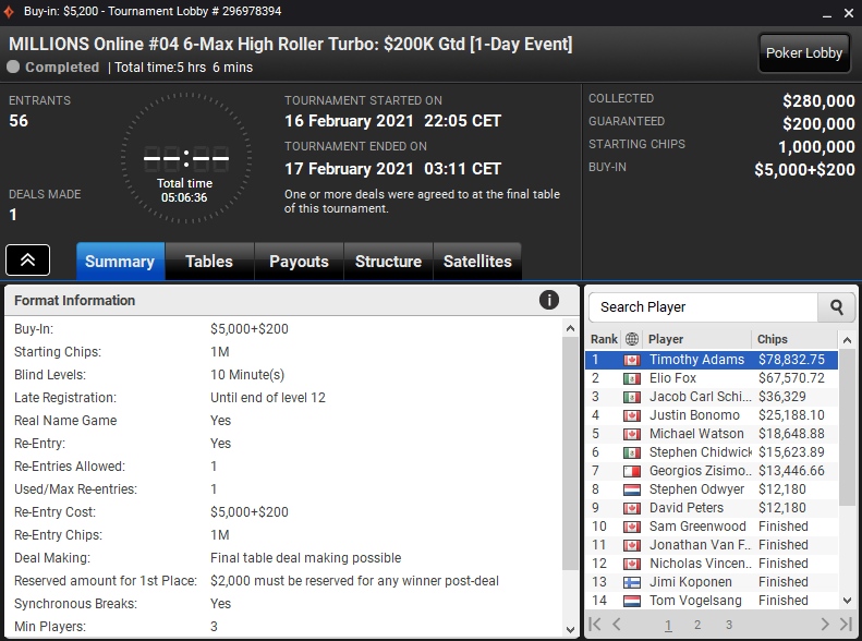 Rezultati finalke MILLIONS Online #04 6-Max High Roller Turbo