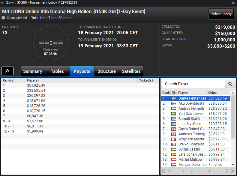 Še ena zmaga za Brazilijo na MILLIONS Online, saj si je vso konkurenco na 3.200 $ Omaha High Rollerju pokoril Dante Fernandes.
