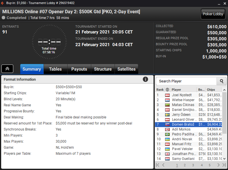 Slavil je Šved Joel Nystedt s prebivališčem v Avstriji, ki mu zmage na High Roller turnirjih niso tuje. Tokrat je v žep pospravil 41.853 $ za zmago in še dodatnih 49.377 $ iz naslova bountyev.