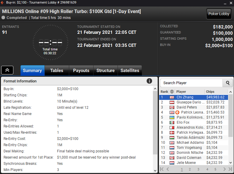 Michael Chi Zhang naj bi bil specialist za high stakes denarne igre, a v zadnjem času prikazuje svoje znanje tudi na največjih turnirjih, tako na spletu kot v živo. Današnji 2.100 $ Turbo turnir je namreč že tretji High Roller MILLIONS, ki ga je osvojil v zadnjih letih.