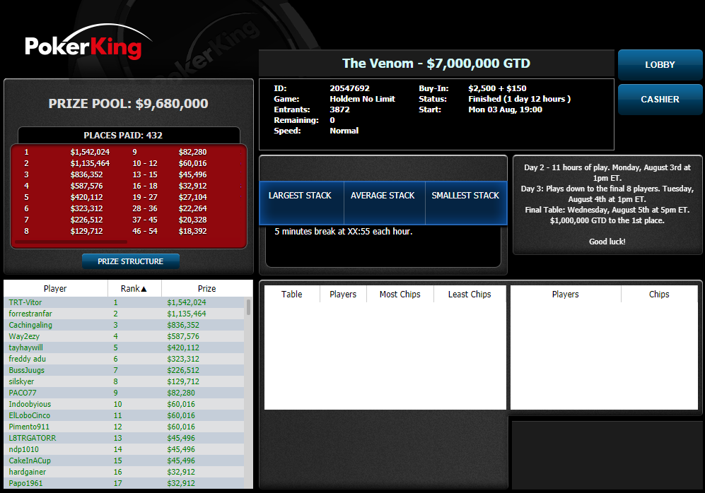 Pravkar končani The Venom na PokerKing (WPN mreža) se je ponovno izkazal kot eden najboljših in največjih spletnih turnirjev. Svoj sedem milijonsk…