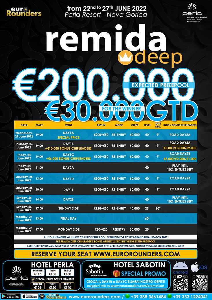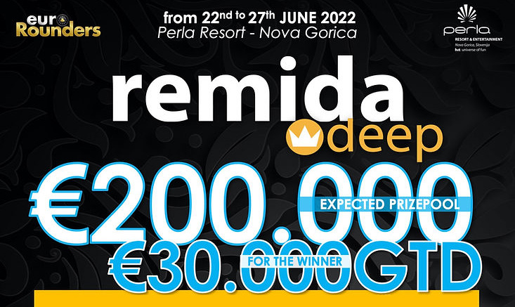 V Poker Room Perla v Novi Gorici se bo znova odvil izjemno priljubljen Remida Deep! Tako kot v februarski izdaji, pričakovan skupni nagradni sklad turnirja, ki se bo igral od 22. do 27. junija 2022, znaša 200.000 €, pri čemer je za zmagovalca glavnega turnirja zagotovljena nagrada v vrednosti 30.000 €.