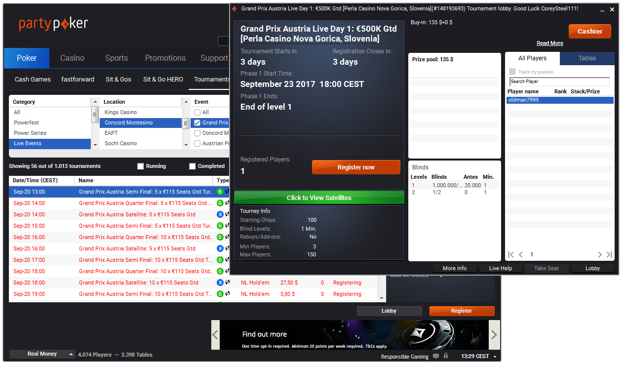 Live Dan 1 $135 turnir, ki bo potekal 23. septembra v Perli v Novi Gorici je že v PartyPoker lobbyu in se nanj že lahko prijavite. Najdete ga v zavihku Tournaments in s filtri “Live Events” – “Concord Montesino” – “Grand Prix Austria“. Igra bo v soboto potekala dokler ne ostane 10% prijavljenih igralcev, kar pomeni, da bodo vsi ti že končali v denarju, tako da vam potovanje v Avstrijo na drugi dan tekmovanja že zagotavlja nagrado. Na Partyu potekajo tudi sateliti, ki se začnejo že pri 1,10 $.