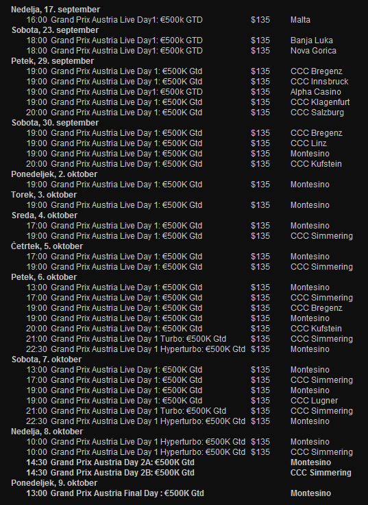 Grand Prix Austria je razdeljen na tri različne dneve. Dan 1 kot rečeno poteka po celotni Avstriji, v Sloveniji (Perla), na Malti, v Bosni in tudi online. Dan 2 bo odigran v casinoju Montesino (2A) in CCC Simmering (2B), eden pa tudi online. Finalni dan, ki bo na sporedu 9. oktobra, pa bo organiziran le v živo v dunajskem Montesinu.