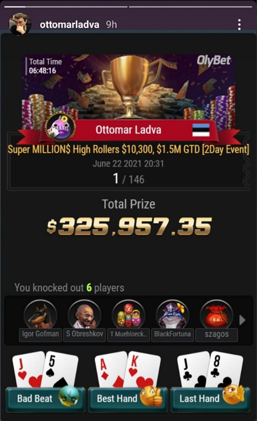 Za estonskega šahovskega velemojstra Ottomarja Ladvo se že ve, da se dobro znajde tudi na poker mizah. Ladva je že pokazal svoje poker spretnosti na februarskem partypoker MILLIONS Super High Rollerju in na aprilskem GG Spring Festivalu, kjer je premagal večino najboljših poker igralcev na svetu in takrat osvojil neverjetnih 525.089 $ in $446,446 nagrad.