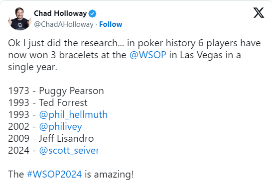 Od leta 2009 je trajalo, da je nekdo na enem WSOP prvenstvu osvojil 3 šampionske zapestnice in ta junak je Scott Seiver!