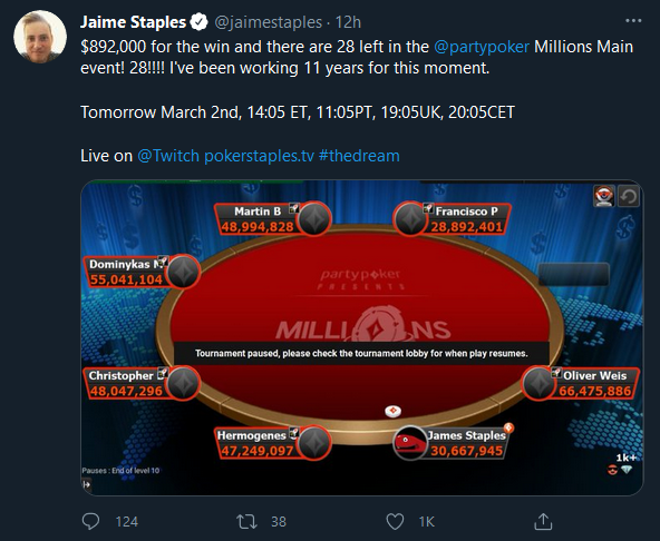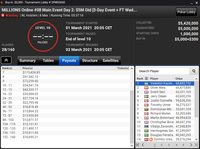 Na vrhu lestvice pa je trenutno neznani Ukrajinec Valentyn Kazantsev z 68,8 milijoni žetonov, eden od štirih, ki so prekoračili znamko 60mio. Drugi trije so Oliver Weis (66,4mio), Endrit Geci (62,3mio) in Jerry Odeen (60,6mio).