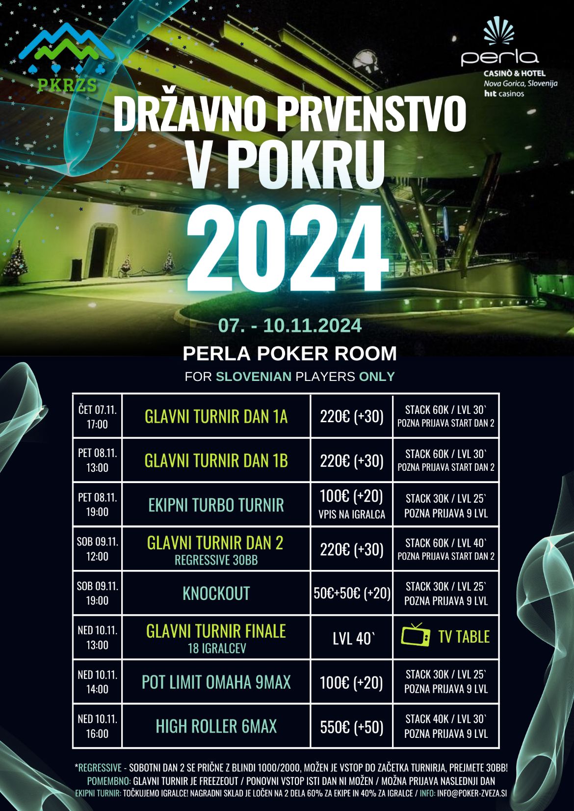 Prvenstvo bo poleg napetih turnirjev prineslo tudi priložnost za srečanje z vsemi pokeraškimi kolegi in prav gotovo se nam obeta najboljši dogodek do sedaj, zato lepo vabljeni v novogoriško Perlo od 7. do 11. novembra!