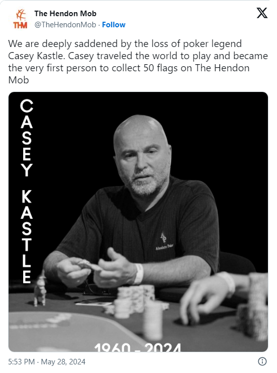 Svet pokra žaluje ob izgubi Caseyja Kastla, ki je umrl v ponedeljek. Kastle, rojen leta 1960, je bil ugleden slovenski profesionalni igralec pokra, k…