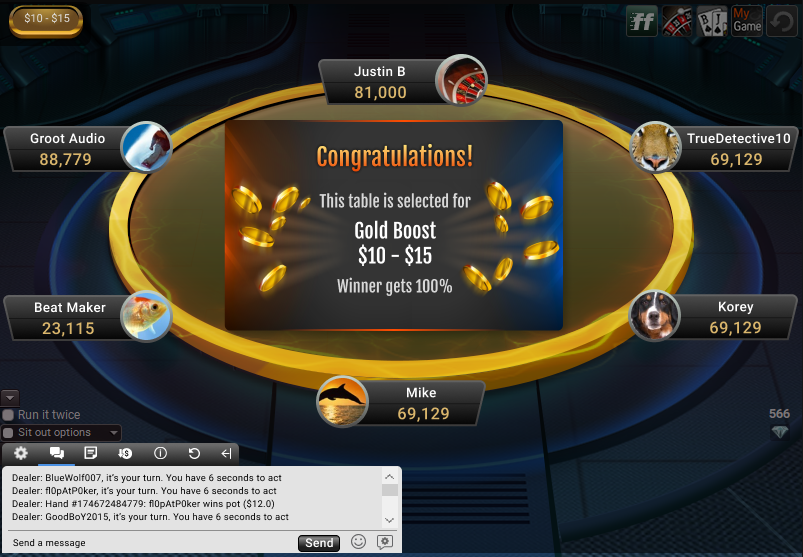 Igrajte izbrano denarno igro No Limit Hold’em (NLHE) ali Pot Limit Omaha (PLO) ali fastforward 0,05$/0,10$ do 0,50 $/1$ za priložnost, da prejmete naključno povečanje pota.