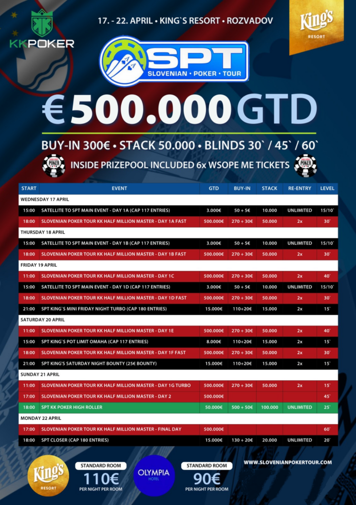 Slovenian Poker Tour (SPT) ki poteka v King’s Resortu Rozvadov, je v polnem teku. Za nami sta prva dva dneva glavnega turnirja, vse pa se zares začenja danes, ko pričakujemo veliko število igralcev. Turnir traja od 17. do 22. aprila in zagotavlja nagradni sklad 500.000 €. Na dogodek, ki ga sponzorira KKPoker, prihajajo igralci iz vsega da se udarijo za delež pol miljonske nagrade.