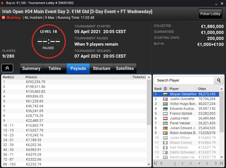 Bolgar Stoyan Obreshkov je trenutno vodilni, potem ko je zbral 98.373.185 žetonov, kar je 141 big blindov, Justin Ouimette je takoj za njim s 101 big blindom, Victor Hugo Bonifacio pa zaostaja že malo več s 57 big blindi.