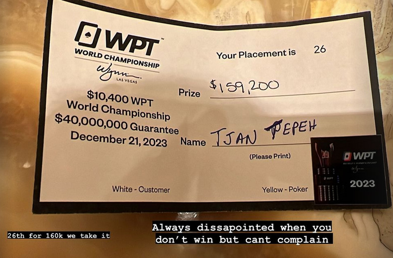 Verjamemo, da po petih dneh grinda na koncu vedno ostane nekaj grenkega priokusa, čeprav je šlo za Tjanov najboljši rezultat v karieri in enega najboljših slovenskih na sploh. Leto 2023 je tako zaključil na res lep način, potem ko je poleti prišel najprej do svojega prvega WSOP Circuit prstana, jeseni pa še do prve slovenske WSOP zapestnice na online WSOP turnirju. Vemo pa, da še zdaleč ni rekel zadnje.