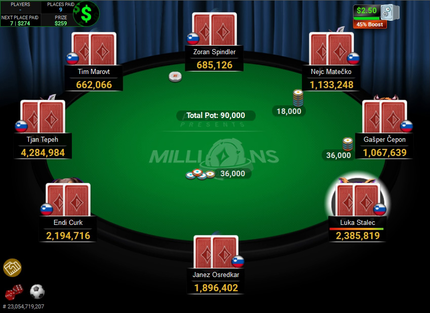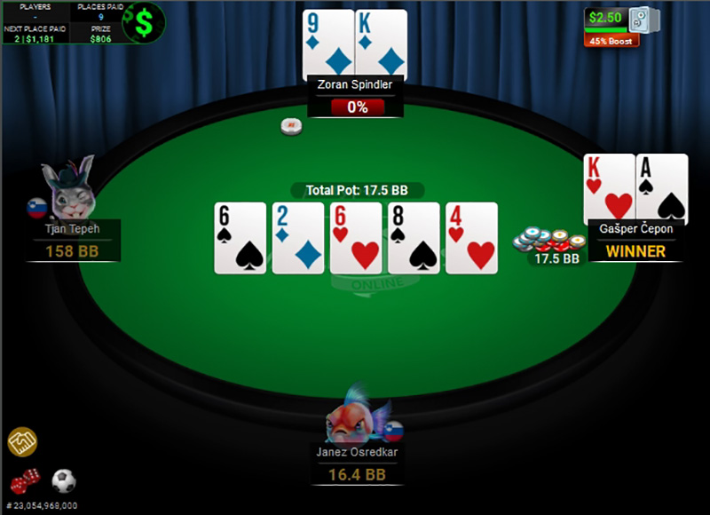 Preostali dvojici ni preostalo drugega, kot da poskušata vzeti čim več žetonov vodilnemu, za morda vsaj nekaj razburljivosti v finalu. Že se je zdelo, da bi to morda uspelo ravno Gašperu, ko sta šla s Tjanom all-in z AK proti KQs, vendar je bilo v nedeljo vse v znamenju slednjega, ki je že na turnu zapečati Čeponovo usodo.