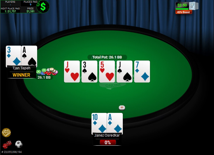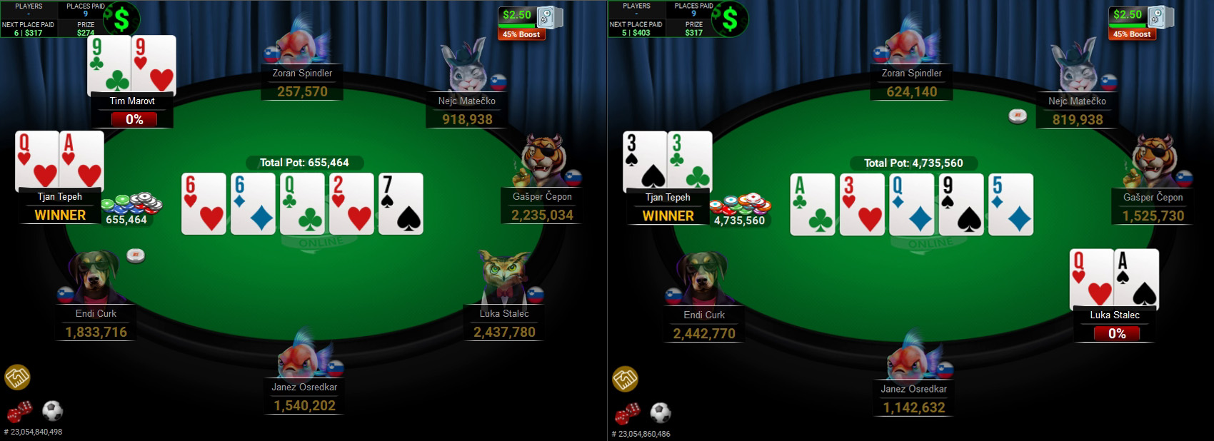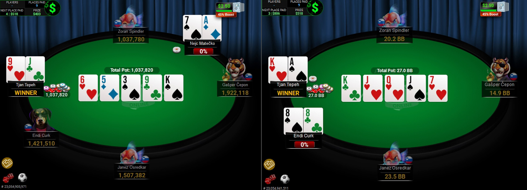 A kaj dosti več od tega ni šlo. Tepeh je po hitrem postopku pridobil nazaj izgubljene žetone in spravil Janeza na manj kot 10bb, ko sta šla ponovno all-in. Tjan je držal K9, Janez pa A8, ki so zdržali. Nato ponovitev zgodbe nekaj handov kasneje s 77 proti K7 in zanimiv runout za 15bb pot.