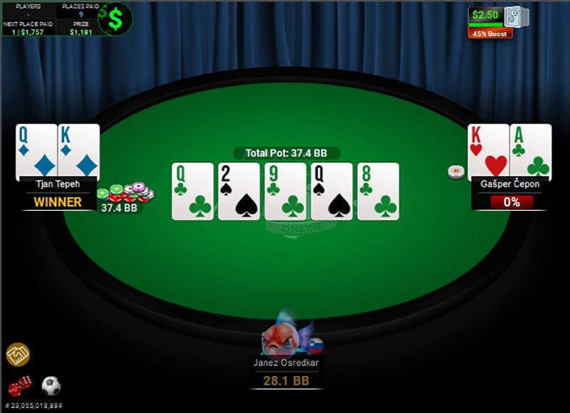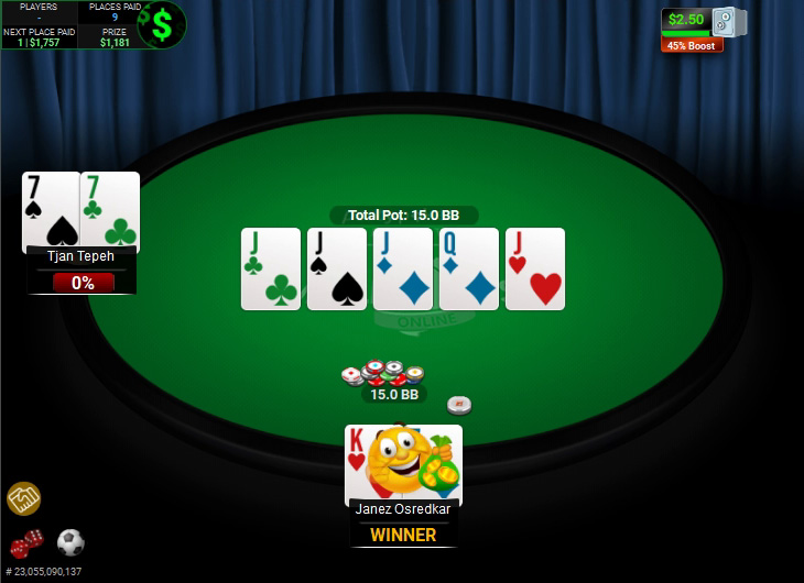 Heads-up se je tako začel z neverjetno 5,5:1 prednostjo v žetonih in le čakali smo na hitri zaključek. Že kaj kmalu sta šla igralca all-in na boardu 7Q5, oba sta država top pair, vendar je imel Janez Osredkar z 8 nekoliko boljši kicker, dve nizki karti na turnu in riverju pa sta mu tako zagotovila double up in prednost se je zmanjšala na 3:1.