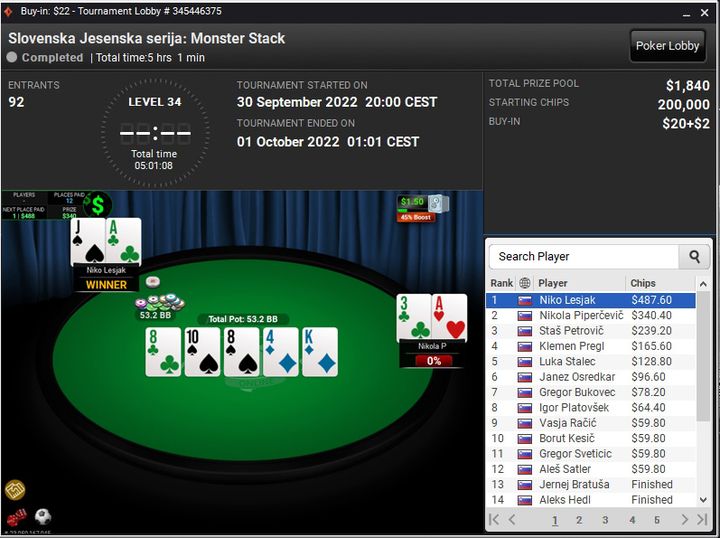 V petek je bil na sporedu $22 Monster Stack turnir, kjer so vsi prijavljeni pričeli z 200bb žetoni pred seboj. Ni bilo veliko igralcev, ki so na seriji igrali na dveh finalkah, ampak Niko Lesjak je bil eden izmed njih. Če je večer poprej končal na tretjem mestu, je tokrat naredil še korak naprej in v Heads-Upu premagal Nikolo za 487,60 $ nagrade.