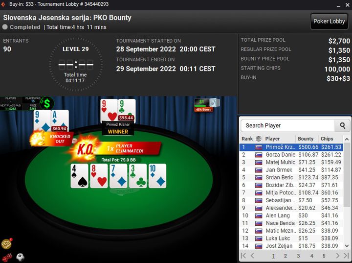 PKO turnirji so vedno popularni in nič drugače ni na slovenskih serijah, saj je $33 PKO vedno eden od vrhuncev. Tudi tokrat se je nabralo za 90 igralcev vpisnin, največji del pogače pa je na koncu pobral Primož Krznar. Za prvo mesto je prejel 261,53 $ nagrad, iz naslova izločenih igralcev pa skoraj še enkrat toliko zraven, in sicer 500,66 $ za skupaj 762,19 $.