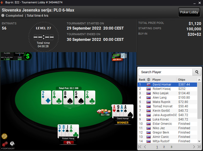 Lep obisk turnirja smo videli tudi na $22 PL Omahi 6-max, kjer je na finalni mizi dominiral David Homar, ki je vodil vse od začetka pa do konca, ter izločil štiri od petih svojih nasprotnikov. Turnir se je končal točno ob polnoči, Homar pa je na svoj party račun prejel 387,44 $.