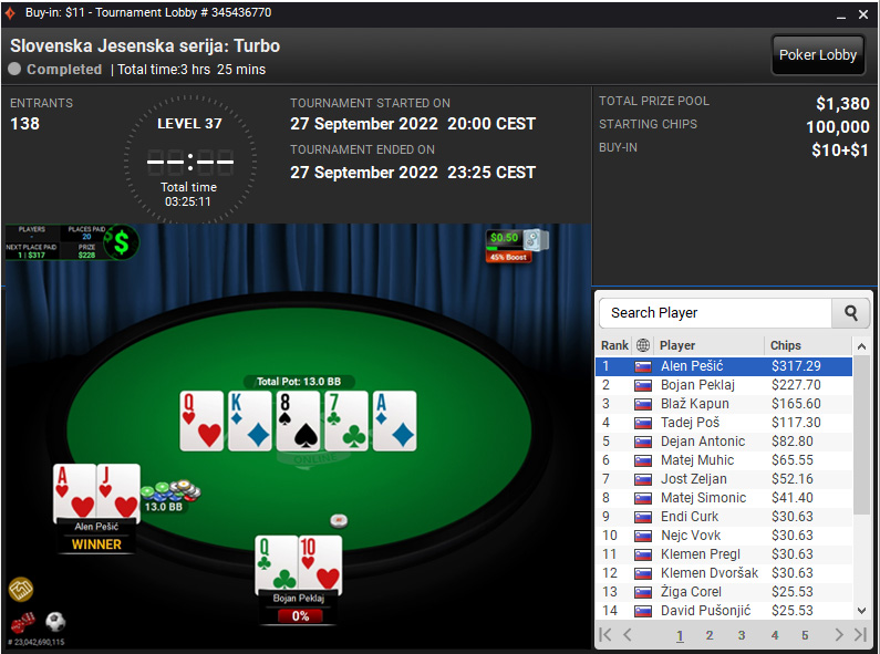 Slovenska jesenska serija se je pričela v torek z $11 Turbo turnirjem, ki je tudi postregel z največ vpisi, saj se jih je na koncu zbralo kar 138. Po treh urah in pol igre pa se je zmage veselil Alen Pešić, ki je dobro manevriral s svojim stackom skozi finalno mizo, v ključnih trenutnih pa nakradel veliko blindov, ki so mu na koncu pomagali do zmage in 317,29 $ nagrade.