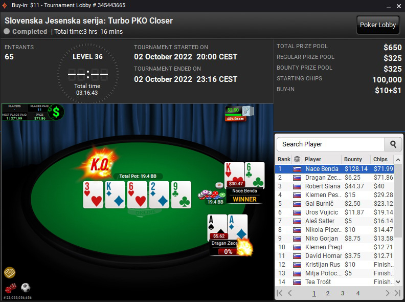 Za konec ob spremljanju finalke Glavnega turnirja, pa še $11 Turbo PKO dogodek, ki je končal v rokah Naceta Bende, ki je v zadnjem handu skrekal Draganove Ase. Klasika. 71,99 $ za prvo mesto, 128,14 $ za eliminacije, torej skupaj 200,13 $ za dobre tri ure klikanja. Ni slabo.