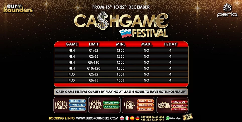 Na svoj račun pa bodo prišli tudi ljubitelji denarne igre, ki bo v okviru Cashgame festivala potekala od 16. do 22. decembra. Limiti se bodo gibali od 1€/2€ do 10€/20€, tako NLH kot tudi PLO.