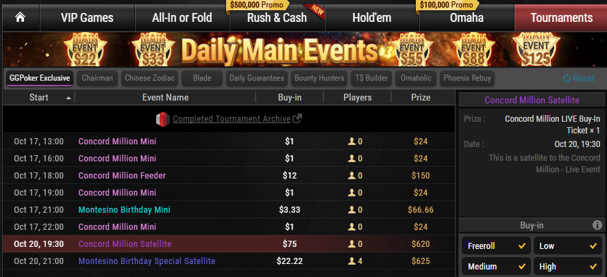 $12 Concord Million Feeder turnirji bodo na sporedu od ponedeljka do sobote ob 18. uri in v nedeljo ob 16. uri. Nagrada na Feederju pa znaša $75 vstopnica za glavni satelit.