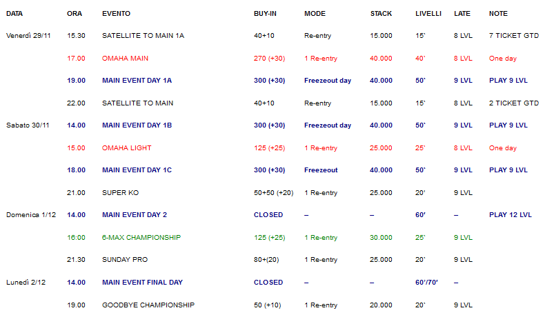 Glavni turnir bo imel pet prvih dni od 1A do 1E, prijavnina pa bo znašala 315+35 €, razen v Day 1A, ki bo imel posebno ceno, saj bo vstopnina le 215+35 €.