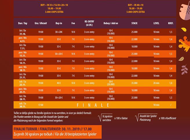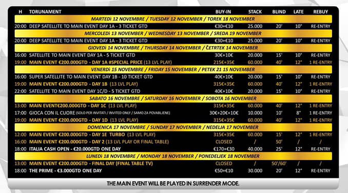 Tudi tokrat že preizkušen spored s številnimi turnirji od Omahe do Knockout in 6-Max. Glavni turnir pa s prijavnino 300+30 € in s tremi začetnimi dnevi. Drugi dan v nedeljo, finalni pa skupaj s TV finalko v ponedeljek.