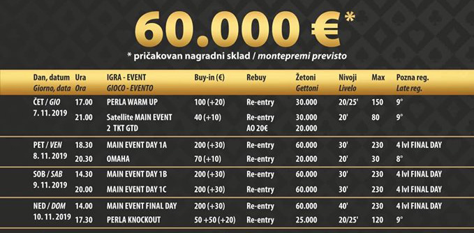 V začetku meseca nas v Novi Gorici čaka Perlin Poker Festival. Tokratna izvedba, ki bo potekala od 7. do 10. novembra bo še bolj bogata kot zadnja, saj bo prijavnina za Main Event znašala 200+30 €, pričakovani nagradni sklad pa je 60.000 €.