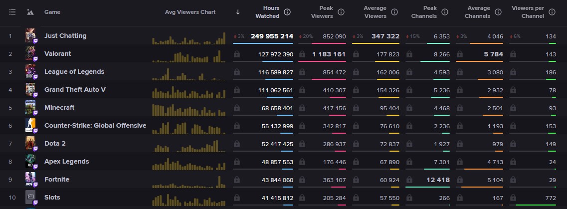 Kategorija igralnih avtomatov na Twitchu je ogromna, saj je celo 10. največja kategorija glede na gledanih ur v zadnjih 30-ih dneh, takoj za Fortnitom in pred World of Warcraftom, med dvema največjima igračarskima velikanoma.
