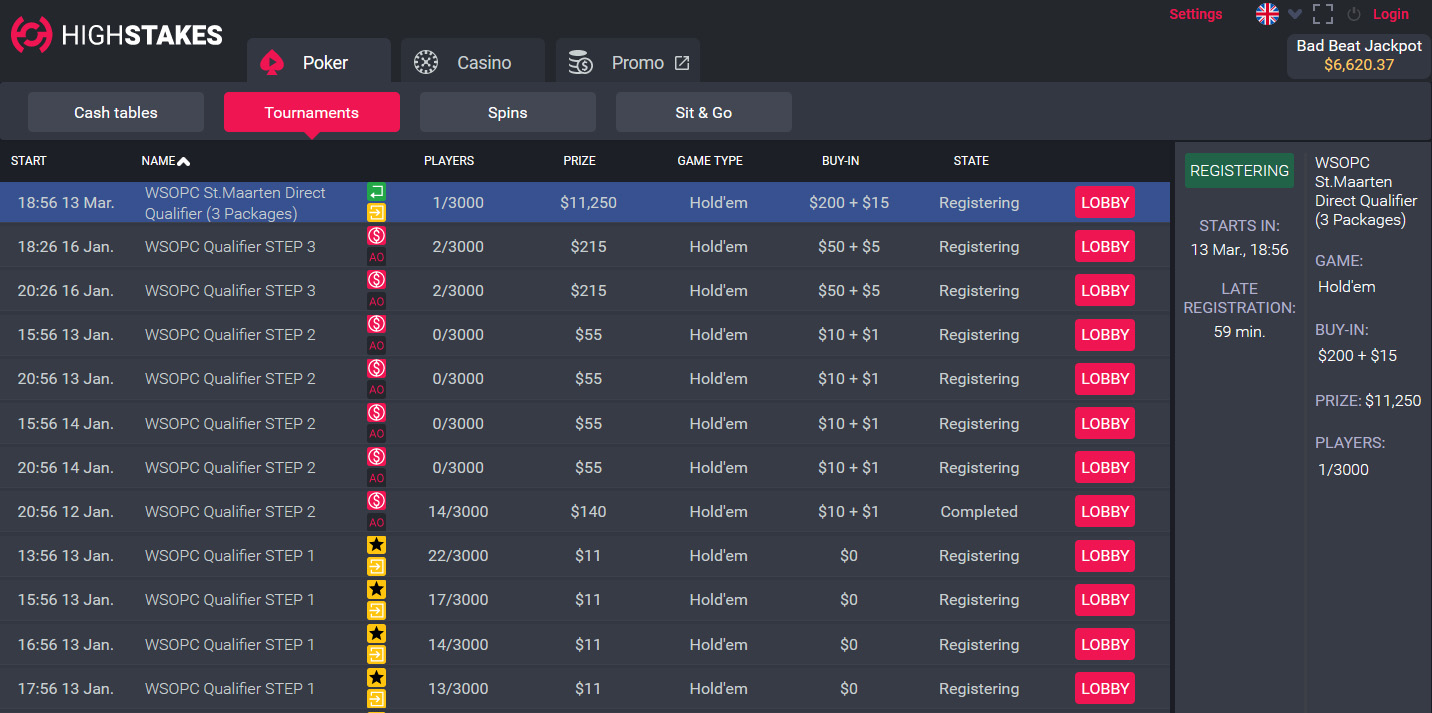 Kvalifikacijski turnirji za WSOPC Caribbean v St. Maartenu so sedaj na voljo na HighStakes. Dogodek bo predvidoma potekal od 23. marca do 4. aprila 2022 na eni izmed najbolj luksuznih destinacij na koledarju pokra.