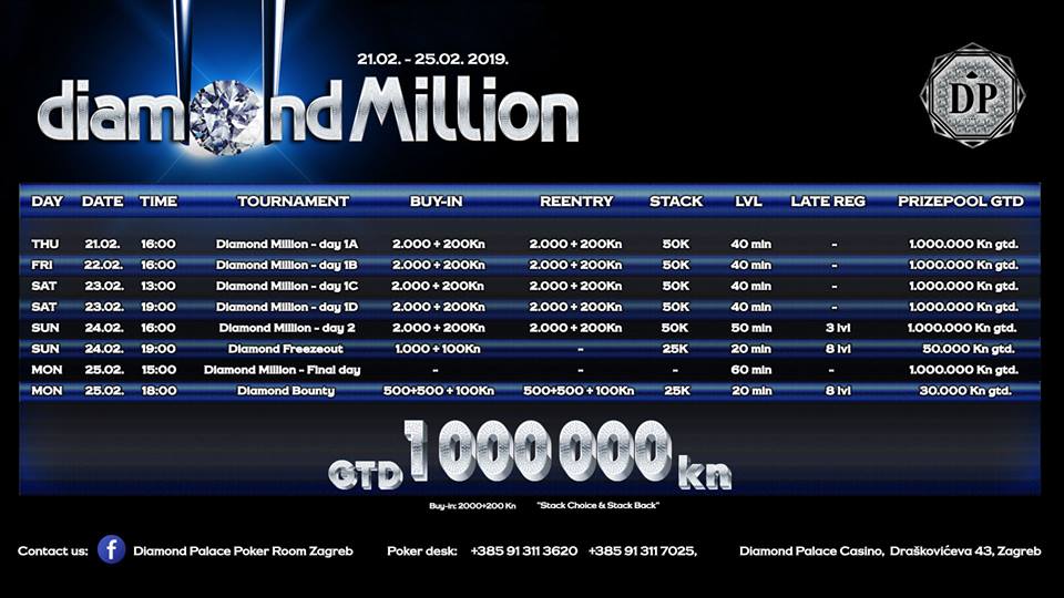 Diamond Million bo na sporedu že tretjič in velja za enega večjih turnirjev na Balkanu, tako da se tudi tokrat pričakuje dober obisk igralcev s celega sveta. Turnir že postaja stalnica za vse ljubitelje turnirske igre v živo.