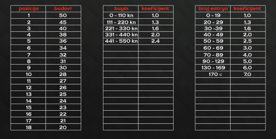 Igralci bodo za ligo prejemali točke glede na končno razvrstitev, koeficient za višino prijavnine in število re-entryev glede na tabelo spodaj.
