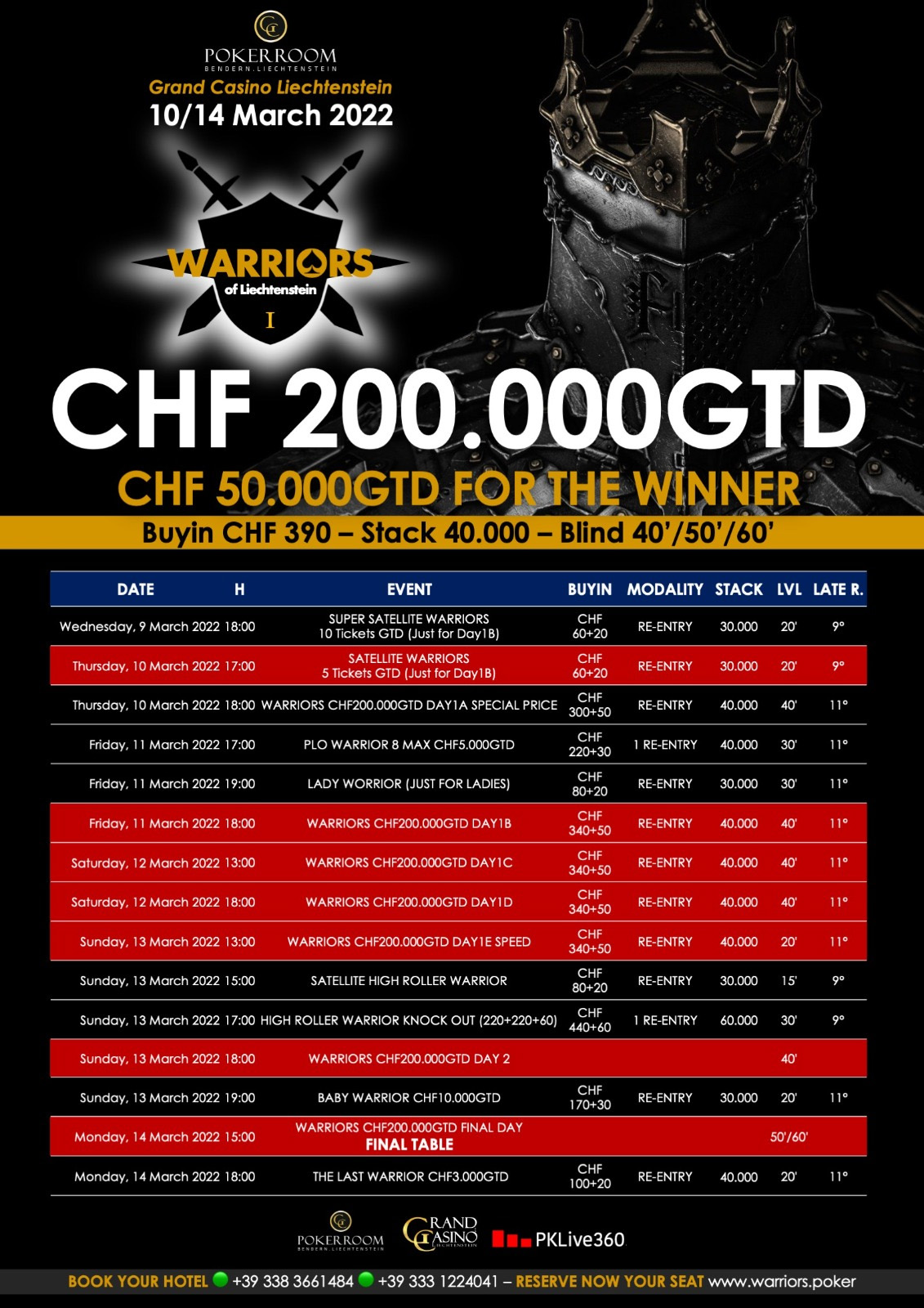 Drugi turnir, ki ga je vredno omeniti je 500 CHF High Roller Warrior KO v nedeljo, ki ga spremlja tudi satelit malo prej v dnevu.