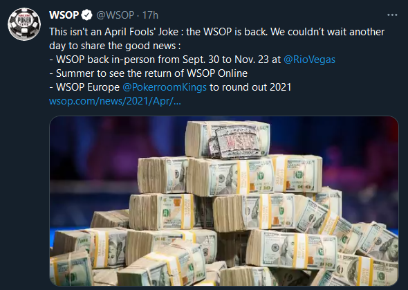 Svetovno znana serija turnirjev se bo jeseni vrnila v igralnico Rio v Las Vegasu, če slučajno ne bo drugačnih državnih/zveznih omejitev, poroča Caesars Entertainment. Karte naj bi bile v zraku za raznolik koledar prireditev, ki se začnejo 30. septembra, vsa igra pa se bo zaključila 23. novembra.