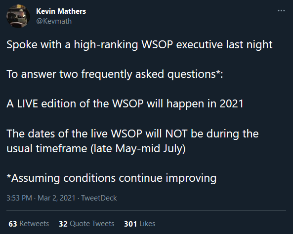 V začetku tega tedna je poker skupnost dobila morda najbolj jasen znak, da se lahko World Series of Poker 2021 zgodi v običajnem okolju. Upanje je povzeto iz twitta, ki ga je objavil strokovnjak za poker informacije Kevin “Kevmath” Mathers. V njem piše, da je govoril z izvršnim direktorjem WSOP, ki je dejal, da se bo letošnja edicija WSOP zgodila v živo, če se bodo razmere za COVID-19 še naprej premikale v pravo smer.