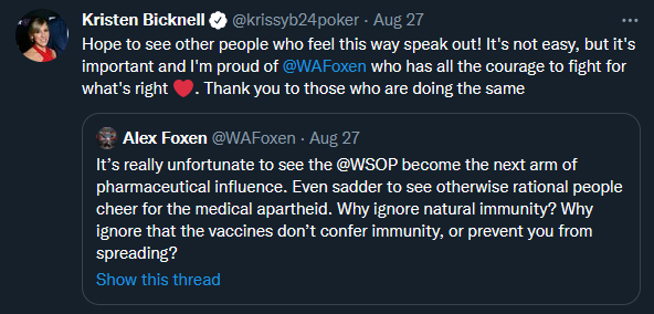 Poker par Alex Foxen in Kristen Bicknell sta bila med odmevnimi igralci, ki sta se izrekla proti pravilu. Kristen je trikratna zmagovalka zapestnice, Foxen pa se poteguje za več nagrad za igralca leta, vendar sta se oba odločila za bojkot serije.