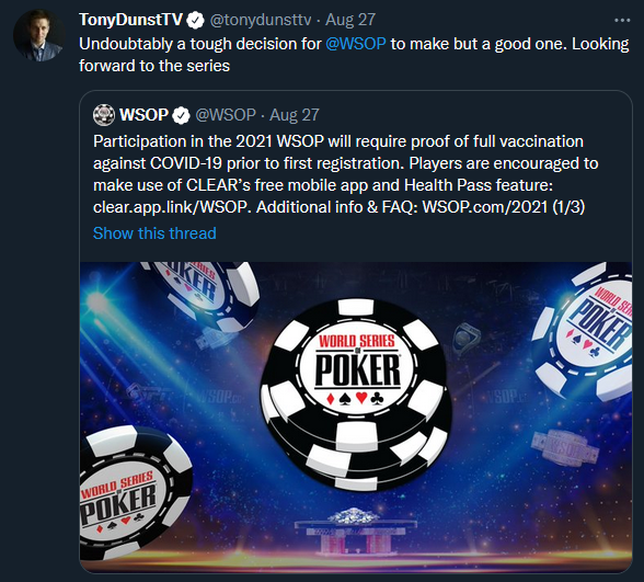 WSOP je objavil, da morate za sodelovanje v seriji 2021 biti popolnoma cepljeni proti COVID-19.