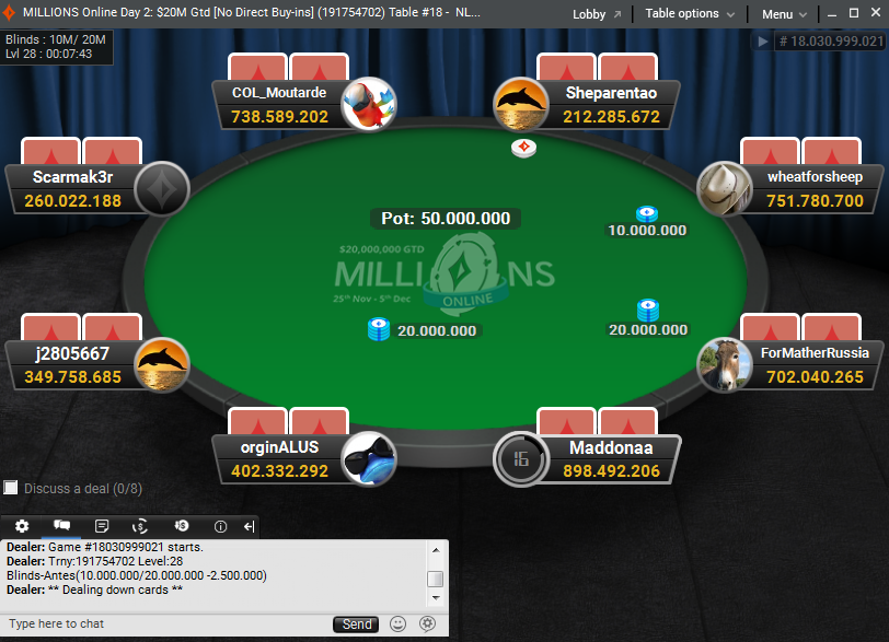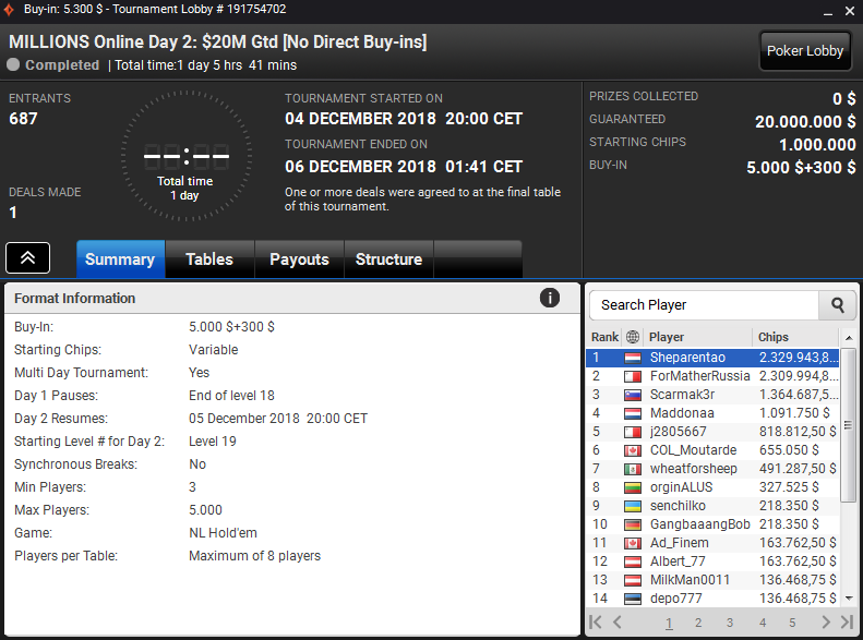 Ko je bilo v igri le še pet igralcev, je imel najmanjši stack Nizozemec Sheparentao, manj kot 10bb, a mu je uspel neverjeten preobrat in prišel celo do vodstva, čeprav je Portugalec ForMatherRussia, ki drugače živi na Malti, imel v tistem trenutku več kot 100bb žetonov. Večji del žetonov je dobil ravno od slednjega.