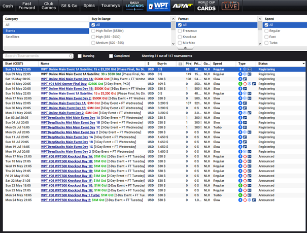 Vsak igralec partypokra lahko zaradi neverjetnega urnika satelitov postane prvak 2021 WPT Online Series. Ti sateliti se začnejo z vstopnino samo 0,01 $! Ti se nato nadaljujejo s prvo fazo z vstopnino 3,30 $, sledi 2. faza z vstopnino 33 $. Če se prebijete skozi te faze satelitov, boste napredovali v tedenski finale, ki bo v nedeljo, kjer bo zagotovljenih vsaj 15x 3.200 $ sedežev.