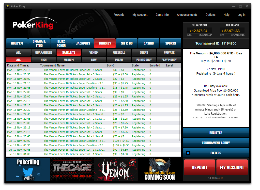 Do nastopa na The Venomu vas loči 7 stopnic, z razliko od navadnih satelitov, kjer morate igrati na zmago, pa je tukaj potrebno le zbrati 5000 žetonov in že ste kvalificirani na naslednjo stopnico.