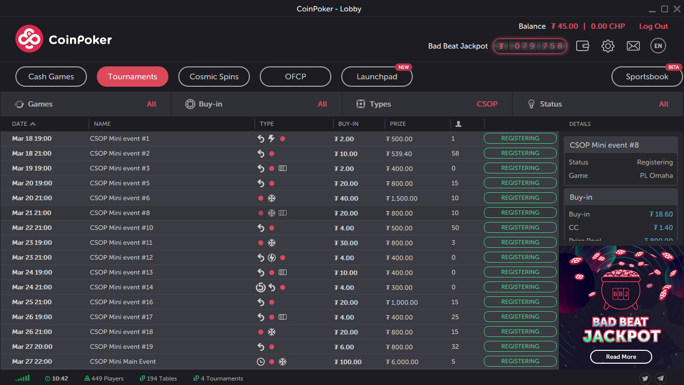 CoinPoker bo izvajal satelite, Freebuy in Freeroll turnirje za vse dogodke CSOP, ki se začnejo nekaj tednov pred začetkom CSOP.